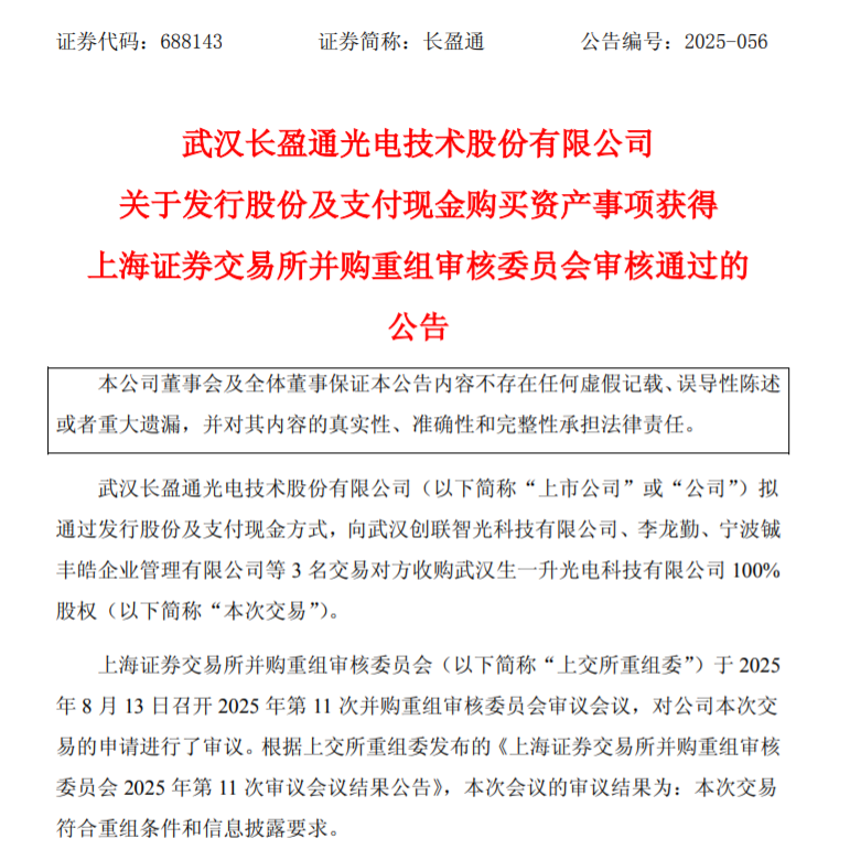 2025年8月19日,长盈通发布公告,其通过发行股份及支付现金方式,收购光通信企业武汉生一升光电科技有限公司100%股权的重组方案,正式获上交所并购重组委审核通过。长盈通是国内光纤陀螺核心器件领域的“专精特新”小巨人,产品广泛应用于军用惯性导航系统。